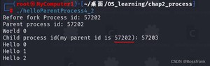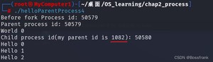 这个代码的逻辑也很明显,fork前输出父进程的进程号pid,然后fork,在父进程中fork的返回值是子进程的pid,不为0,进入else分支,在else分支中输出父进程的pid,并打印三次world。对于子进程,fork的返回值是0,进入if分支,输出子进程对应父进程的pid(即函数getppid())已经子进程自身的pid,并打印三次hello。运行结果如下: