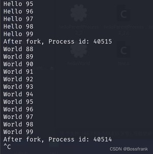 在上一段代码中,由于父子进程进入的条件分支的代码都很短,很快就执行完了,因此貌似好像是顺序执行的。如果我们让父子进程各自执行的代码量提升,在一个时间片内无法执行完,就可以看到父子进程切换的效果。简单起见,我们仅需要让循环语句的次数增加即可。比如设置到100,代码详见helloParentProcess2_2.c: