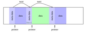 首先我们要确定所采用的数据结构。一个简单可行方案是将堆内存空间以块(Block)的形式组织起来,每个块由meta区和 数据区组成,meta区记录数据块的元信息(数据区大小、空闲标志位、指针等等),数据区是真实分配的内存区域,并且数据区的第一个字节地址即为 malloc返回的地址。