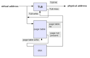 MMU映射单位并不是字节,而是页,这个映射通过查一个常驻内存的数据结构页表来实现。现在计算机具体的内存地址映射比较复杂,为了加快速度会引入一系列缓存和优化,例如TLB等机制。下面给出一个经过简化的内存地址翻译示意图,虽然经过了简化,但是基本原理与现代计算机真实的情况的一致的。