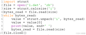 其中,第1行代码导入struck模块;第二行代码以二进制读取的方式打开“1.dat”二进制文件;第3行代码通过struct模块中的calcsize()函数获取整型数据对应的“字节串”格式的大小;第4行代码通过read()函数读取“1.dat”中的“一个数据”;第5-9行代码通过while循环逐个读取“1.dat”中的“字节串”数据,并通过unpack()函数将“字节串”数据转换为整型数据并打印出来;第10行代码关闭文件。以上代码运行的效果如图4所示。