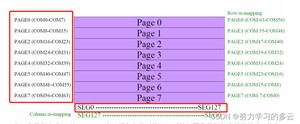 SSD1306是一个为映射静态 RAM 保存位模式来显示。该 RAM 的为 128 * 64 bit大小,RAM 分为 8 页,从 PAFE0 到 PAGE7,用于单色 128 * 64 点阵显示,如下图所示