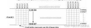 当一个数据字节写到 GDDRAM 中,所有当前列的同一页的行图像数据都会被被填充(比如, 被列地址指针指向的整列(8 位)都会被填充)。数据位 D0 写到顶行,而数据位 D7 写到底行,如下图所示