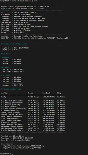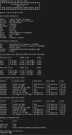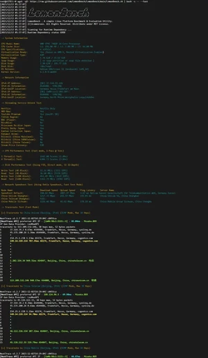 这个脚本能自动执行业内最佳的性能基准测试工具。它包含了几项测试来检验服务器关键领域的性能:使用 fio 测试磁盘性能,使用 iperf3 测试网络性能,以及使用 Geekbench 测试 CPU/内存性能。