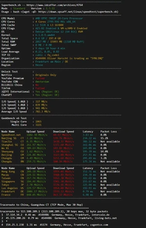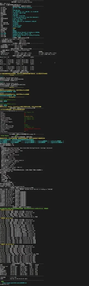 一款聚合了很多其它脚本的 all-in-one 测评脚本,相比 YABS 少了 Geekbench 测试,多了 IP 质量与流媒体解锁,以及大陆网络路由测试。