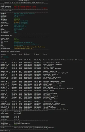 利用著名的 Ookla speedtest.net 服务对全球各地的服务器进行全面的速度测试,展示网速、延迟和数据包丢失等数据。network-speed.xyz 还可以进行区域速度测试,我这里跑一遍完整测试消耗了 90 多 G 流量,有流量限制的服务器建议添加参数选择区域速度测试。