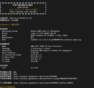 进行 Geekbench 测试需要服务器至少有 1G 的可用内存,如果提示内存不足请开启 SWAP 再进行相关测试;一次 Geekbench 测试大约耗费 10 来分钟的时间,而 Unixbench 需要花费更多时间。