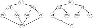 以上图为例,假定V1是出发点,首先访问V1。这时两个邻接点V2、V3均未被访问,可以选择V2作为新的出发点,访问V2之后,再找到V2的未访问过的邻接点。同V2邻接的有V1、V4和V5,其中V1已经访问过了,可以选择V4作为新的出发点。重复上述搜索过程,继续依次访问V8、V5。访问V5之后,由于与V5相邻的顶点均已被访问过,搜索退回到V8,访问V8的另一个邻接点V6.接下来依次访问V3和V7,最后得到的访问序列为V1→V2→V4→V8→V5→V6→V3→V7。