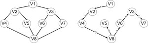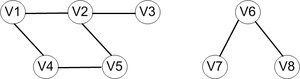 以上讨论的图的两种遍历方法都是针对无向连通图的,它们都是从一个顶点触发就能访问到图中的所有顶点。若无方向图是非连通图,则只能访问到初始点所在连通分量中的所有顶点,其他分量中的顶点是无法访问到的。如下图所示,V6、V7以及V8三个顶点均访问不到。为此,需要从其他每个连通分量中选择初始点,分别进行遍历,才能够访问到图中的所有顶点。