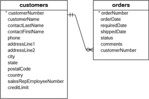 我们来看看在示例数据库(yiibaidb)中的两个表:订单表和客户表,两个表的 ER 图如下所示 -
