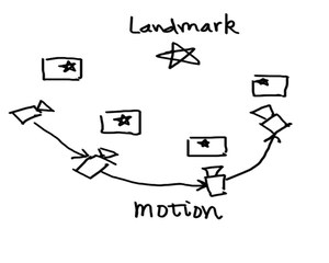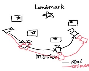 这个图着实画的有点丑,请大家不要吐槽……不管怎么说,它表达出我想表达的意思。在这张图中,我们有一个路标点(五角星),并在各个关键帧中都看到了这个点。于是,我们就能用PnP或ICP求解相邻关键点的运动方向。这些在上篇文章都介绍过了,包括特征选择,匹配及计算等等。那么,这个过程中有什么问题呢?