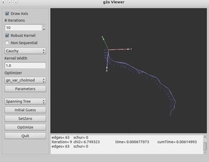 l 把你得到的关键帧作为节点,变换矩阵作为边,加入到optimizer中。同时设定节点的估计值(如果没有惯性测量就设成零)与边的约束(变换矩阵)。此外,每条边还需设定一个信息矩阵(协方差矩阵之逆)作为不确定性的度量。例如你觉得帧间匹配精度在0.1m,那么把信息矩阵设成100的对角阵即可。