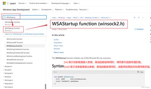 我们socket编程第一个要用到的函数就是WSAStartup,嘶?这是干嘛的呢?见名知意,W代表Windows操作系统,S代表socket(套接字),A代表应用程序编程接口(API),函数用于初始化winsock库,那么这个函数应该怎么用呢?这时就要用到帮助文档了。