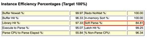 - Soft Parse:软解析的百分比(Softs/Softs+Hards),近似当作sql在共享区的命中率,太低则需要调整应用使用绑定变量。sql在共享区的命中率,小于<95%,需要考虑绑定,如果低于80%,那么就可以认为sql基本没有被重用。