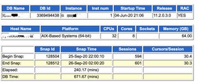 报告一开始部分为基本信息,显示了DB实例、主机信息。DB Time 指标可以用来判断数据库是否繁忙,如果 Elapsed 时间乘以CPU个数小于DB Time 表示数据库比较繁忙。