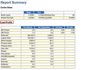 注意 Load Profile 中的指标提供了 Per second 和 Per transaction 两个维度。Per second 主要是把快照抓到的值除以两个快照之间的秒数。这是我们用来判断性能的主要维度。Per transaction 是基于事务的维度,主要是把快照抓到的值除以两个快照之间的事务数。