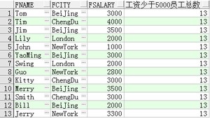 除了这种较简单的使用方式,有时需要从不在聚合函数中的行中访问这些聚合计算的值。比如我们想查询每个工资小于 5000 元的员工信息(城市以及年龄),并且在每行中都显示所有工资小于 5000 元的员工个数: