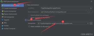 这里的解释器要选择我们创建的虚拟解释器的路径,最后要包括python.exe