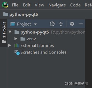 3、此时在Project项目中python-pyqt5就可以看到一个文件夹为venv,这个就是虚拟环境