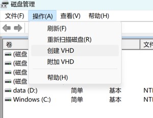 按win+x打开菜单,选择磁盘管理。创建VHD