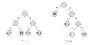 由ABCD构成叶子结点的二叉树形态有许多种,但是WPL最小的树只有3.1.b所示的形态。则3.1.b树为一棵霍夫曼树。