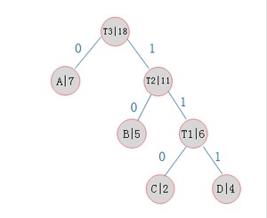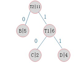 构造霍夫曼树主要运用于编码,称为霍夫曼编码。现考虑使用3.1中ABCD结点以及对应的权值构成如下长度编码。
