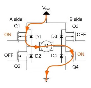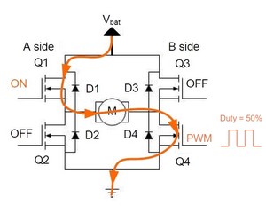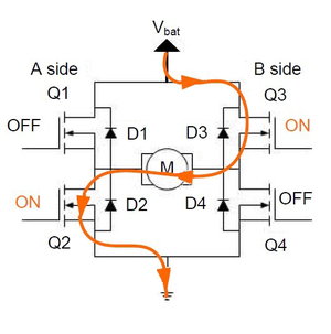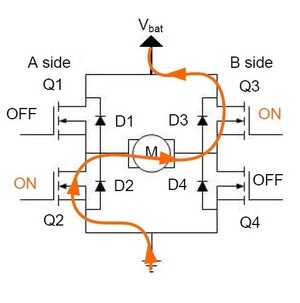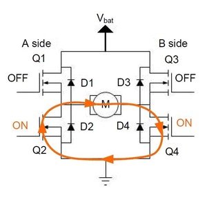 第二种:准备停止的时候,关闭,打开,这时候电流并不会衰减地很快,电流循环在Q2,M,Q4之间流动,通过MOS-FET的内阻将电能消耗掉;