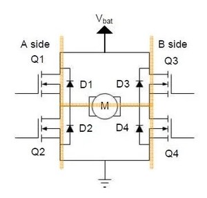 这里有四个开关元器件,,,,另外还有一个直流电机M,,,,是MOS-FET的续流二极管;
