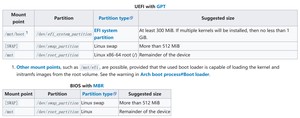 接下来贴一下arch Linux官方wiki给的分区建议,上面为UEFI,下面为Bios