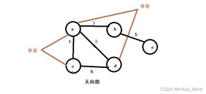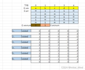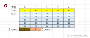假设我们现在顶点数为5个,边数为5,顶点数据为 a,b,c,d,e,矩阵元素都为无穷,并定义个结构体变量则结构表示出来为: