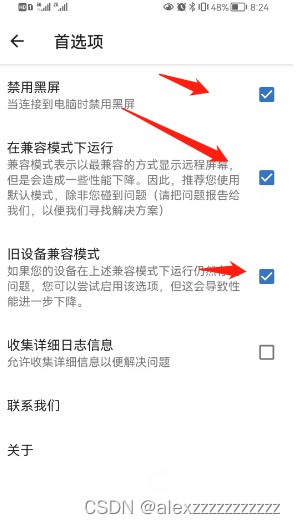 拔掉移动设备的数据线,点击右上角的齿轮,将在兼容模式下运行和旧设备兼容模式勾选上,插上数据线,等待吧,这个时候你的移动设备就真的可以作为扩展屏使用了。