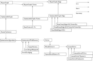 它表示了g2o中的类结构。 首先根据前面的代码经验可以发现,我们最终使用的是一个对象,因此我们要维护的就是它(对它进行各种操作)。 一个SparseOptimizer是一个可优化图(OptimizableGraph),也是一个超图(HyperGraph)。而图中有很多顶点(Vertex)和边(Edge)。顶点继承于BaseVertex,边继承于BaseUnaryEdge、BaseBinaryEdge或BaseMultiEdge。它们都是抽象的基类,实际有用的顶点和边都是它们的派生类。我们用和向一个图中添加顶点和边,最后调用完成优化。