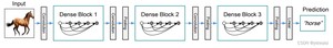 DenseBlock模块其实就是堆叠一定数量的DenseLayer层,在整个DenseBlock模块内不同DenseLayer层之间会发生密集连接,在DenseBlock模块内特征层宽度不变,不存在stride=2或者池化的情况。在一个block内部(即特征图大小都相同),将所有的层都进行连接,即第一层的特征会直接传输给后面的所有的层,后面的层会接受前面所有层的输出特征,一个块中有多个卷积层,每个卷积层的输入来自前面所有层的输出。