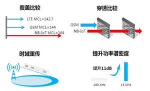 NB-IoT通过时域重传技术和提升功率谱密度,相比GSM提升了20dB的MCL,覆盖距离达到了GSM的三倍,穿透能力相当于比GSM能多穿透两堵墙。其中时域重传技术是指在信息传输过程中反复重传相同消息,可以增强信道条件恶劣时的传输可靠性,能够提升9dB的下行增益和12dB的上行增益。提升功率谱密度则是指将180kHZ的带宽分为12个15kHZ的子载波,并使用子载波进行传输,比起直接使用180kHZ的带宽进行传输能够提升11dB的增益。