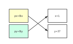 在pswap函数中,由于传递的是两个变量的内存地址(指针)使得我们可以直接操作对应的值。实际上这里还是存在按值传递的问题,只是由原先的整形传递变成了指针传递。我们可以修改指针指向的内存却依然无法修改指针本身。第二个可行的做法是想形参声明为指针的引用: