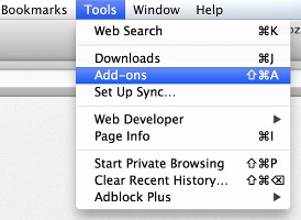 点击 Firefox >> 附加组件( 对于 Mac OS X / Linux,点击菜单栏的"工具" >> "附加组件"),打开 Firefox 附加组件管理器。