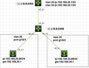 设备名 IP地址/网络掩码 网关 PC1 192.168.20.88/24 192.168.20.1 PC2 192.168.30.88/24 192.168.30.1二层交换机SWB的配置信息