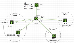 通过一台路由器,使用VLAN间互通数据通过路由器进行三层转发。在路由器的一个物理接口上通过配置子接口(即逻辑接口)的方式来实现以一当多的功能。路由器同一物理接口的不通子接口作为不同的VLAN默认网关,当不同VLAN间的用户主机需要通信时,只需要将数据包发送给网关,网关处理后再发送至目的主机所在的VLAN,从而实现VLAN间的通信。