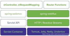 Webflux模式替换了旧的Servlet线程模型。用少量的线程处理request和response io操作,这些线程称为Loop线程,而业务交给响应式编程框架处理,响应式编程是非常灵活的,用户可以将业务中阻塞的操作提交到响应式框架的work线程中执行,而不阻塞的操作依然可以在Loop线程中进行处理,大大提高了Loop线程的利用率。官方结构图: