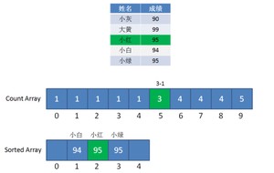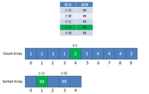 当我们填充统计数组之后,我们只知道有两个成绩并列95分的学生,却不知道谁是小红,谁是小绿: