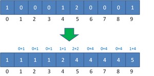 对此,我们只需在填充完统计数组之后,对统计数组做一下变形。我们仍然以学生的成绩表为例,把之前的统计数组进行变形,统计数组从第二个元素开始,每一个元素都加上前面所有元素之和:
