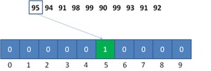 对于第一个整数95,对应的统计数组下标为95-90=5,如图所示:
