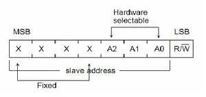 在启动条件之后,发送的第一个字节称为控制字节。控制字节的前七位构成从机地址。