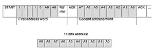 - 第一个地址字包含常规代码,如 MSB 上的“11110”,以告知总线上的从机 10 位设备地址。之后,它包含 10 位地址和 R/W 位的两个 MSB。