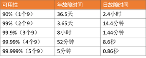 高可用性是指系统具有较高的无故障运行能力,可用性 = 正常运行时间 / 系统总运行时间,一般使用几个9来描述系统的可用性。