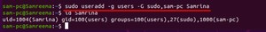 在以下示例中,我们创建了一个名为“Samrina”的新用户并分配了多个组。主要组是“users”,次要组是“sudo、sam-pc”。