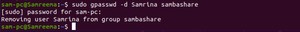 例如,我们要从“sambashare”组中删除用户“Samrina”,请将上面的命令更改为以下形式来完成此任务: