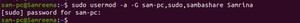 举个例子,要将现有用户“Samrina”添加到多个组中,例如“sam-pc、sudo、sambashare”,请运行以下命令: