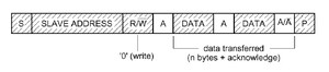 在进行写操作时,SCL一直保持时钟的信号,SDA线的传输以8位为一个单位,在进行第一个8bit的传输后,若从设备接收到传输信号,则会返回一个应答信号ack,然后拉低SDA线,进行下一步的数据写入,写周期时序图如下图所示 ,twr 为进行数据写入的时钟周期