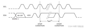 IIC传输的开始及结束如下图4所示,在SCL为高电平期间,SDA由高变低,即为start信号;在SCL为高电平期间,SDA信号由低变高,即为stop信号.